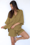 חולצה מבד פשתן בגזרת אוברסייז בשילוב שרוולי 3/4 קצרים ורחבים בצבע מטריף - שלבי כסט עם שורט תמרה לארוע קליל