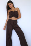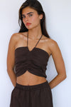 טופ סטרפלס עם גזרת קולר וכיווצים שמחמיאים לגוף, בחלקו האחורי כיווצי גומי לאחיזה מדוייקת.בד הפשתן נעים, גמיש ונושם בצבע שוקולד עשיר – מושלם לקיץ או לערב קליל.