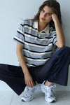 חולצת פולו קלאסית בגזרה רחבה ומשוחררת, עשויה מבד כותנה רך ואוורירי שמרגיש נעים במיוחד על הגוף.החולצה מעוצבת בדוגמת פסים אופקיים בגווני אפור, כחול נייבי ושמנת – שילוב מדויק של צבעים שמוסיף עניין מבלי לוותר על ניקיון ואלגנטיות.