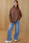סריג בגזרת אוברסייז עשוי מבד נעים ומלטף כמו ענן. לסריג צווארון גולף עדין בשילוב פסים דקיקים בסיומת השרוול ובחלק התחתון