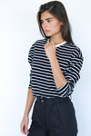 חולצת בייסיק מבד כותנה נעים למגע, בגזרה יחסית משוחררת בשילוב פרינט של פסים לאורכו