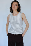 ווסט מבד פשתן (30%) מותאם למזג הישראלי, בצבע שיבולת שועל בהירה בשילוב פסים שחורים לאורכו. לווסט חמישה כפתורים בצבע אוף ווייט ושרוך לקשירה בגב להתאמה מושלמת למותן