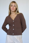 קרדיגן בייסיק מבד עבה ואיכותי בגזרת וי עמוק בגוון שוקולד חמים. לקרדיגן כפתורים בולטים והגזרה ישרה ומדוייקת
