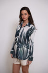 חולצה מכופתרת, בגזרה משוחררת עושיה מכותנה קלילה ונעימה. לחולצה פרינט עלים ירוקים גדולים על רקע לבן