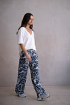 מכנסיים מבד דק וקליל, בגזרה משוחררת בשילוב רוכסן ושני כיסים בחלק הקדמי. המכנסיים בגזרה ישרה ופרינט עלים כחולים כייפים. הדוגמנית לובשת מידה סמול