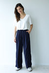 מכנסיים שהם מיקס בין אלגנט לקז׳ואל ליומיום. מכנסיים בצבע כחול נייבי כהה בגזרה משוחררת מבד דנים דק ואיכותי. למכנסיים שרוך וגומי במותן להידוק נכון