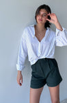 שורט אלגנטי תפור היטב, בגזרת מותן בשילוב דיטיילז מטריפים ואיכותיים. לשורט שני כיסים לצד פנסים עדינים וסגירת כפתור מוארכת לשמאל. בתחתית השורט שני קיפולים