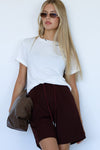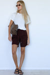 ברמודת קיץ בגוון בורדו עמוק, בגזרה ישרה ומעודנת. עשויה ממיקס בדים איכותי ונעים שמעניקה לה מבנה מדויק. הגימורים מוקפדים, שני כיסים בצדדים, גומי במותן בחלק האחורי  ושרוך בצבע תואם כדי שישב בצורה הטובה ביותר. הברמודה אינה קצרה כמו שורט והיא בחירה מושלמת למי שמחפשת שיק נקי ונוכחות שקטה.