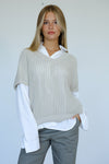 חולצת/אפודת סריג בצבע אבן בגזרת אוברסייז משוחררת האפודה מגיעה במידה אחת - אך מתאימה לרוב למידות אקסטרה סמול - עד לארג' (שימו לב למידות החולצה)